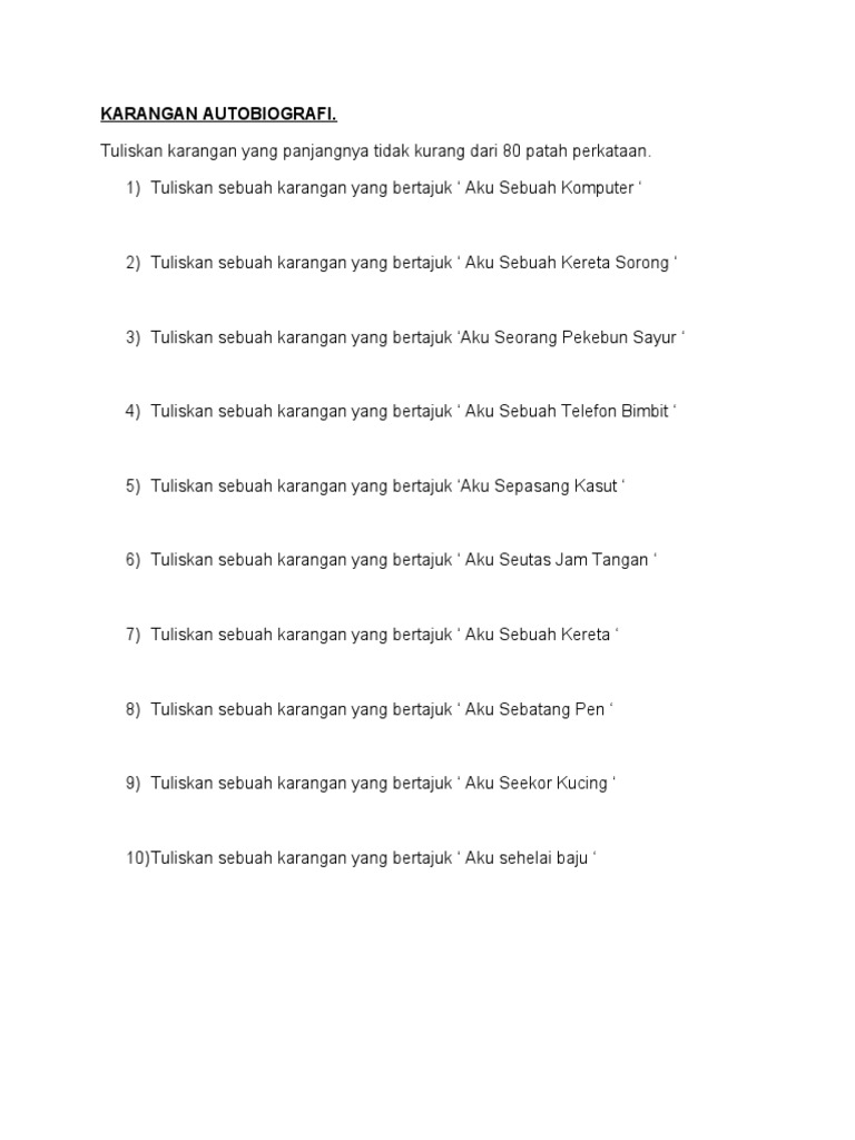 Berikut merupakan contoh bagi soalan karangan. Contoh Autobiografi 2000 kata. Contoh Ayat menggunakan Perkataan penciptaan dalam bahasa Melayu.